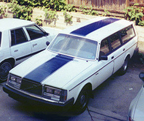 I wasn't completely satisfied, however. The middle stripe wasn't thick enough. Greg tried to convince me to leave it how it was, but I knew I wouldn't be happy if I did. (Luckily, I made this decision before doing the roof or the back of the Volvo.) So while he drove out to buy more paint, I realigned the tape for my newer, thicker stripes. Indents from the original job remain, but I'm glad I redid it. The new stripes looked just how I had imagined they would. The first time I got into my newly decorated car, I laughed. The blue lines were almost distracting. But maybe it was just that I couldn't stop peeking at them because they looked so cool.